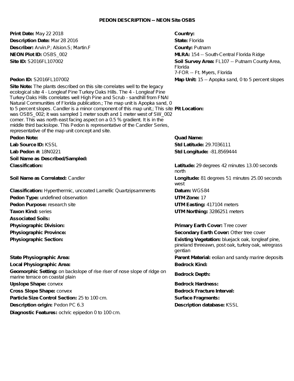 Ordway-Swisher Biological Station (OSBS) Plot Pedon Descriptions, March 2016