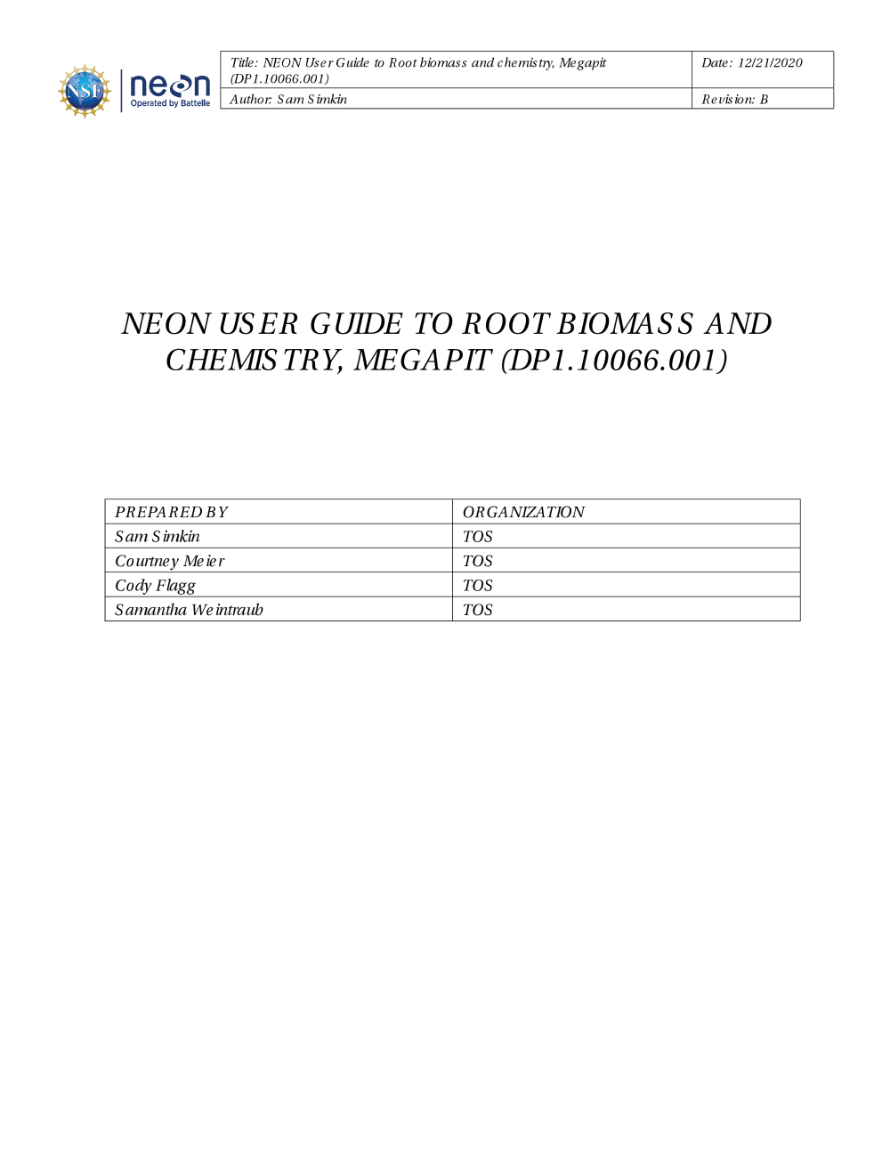 Uploaded by Claire Lunch, 10/2/20 1:24 PM NEON User Guide to Root Biomass and Chemistry, Megapit (DP1.10066.001)