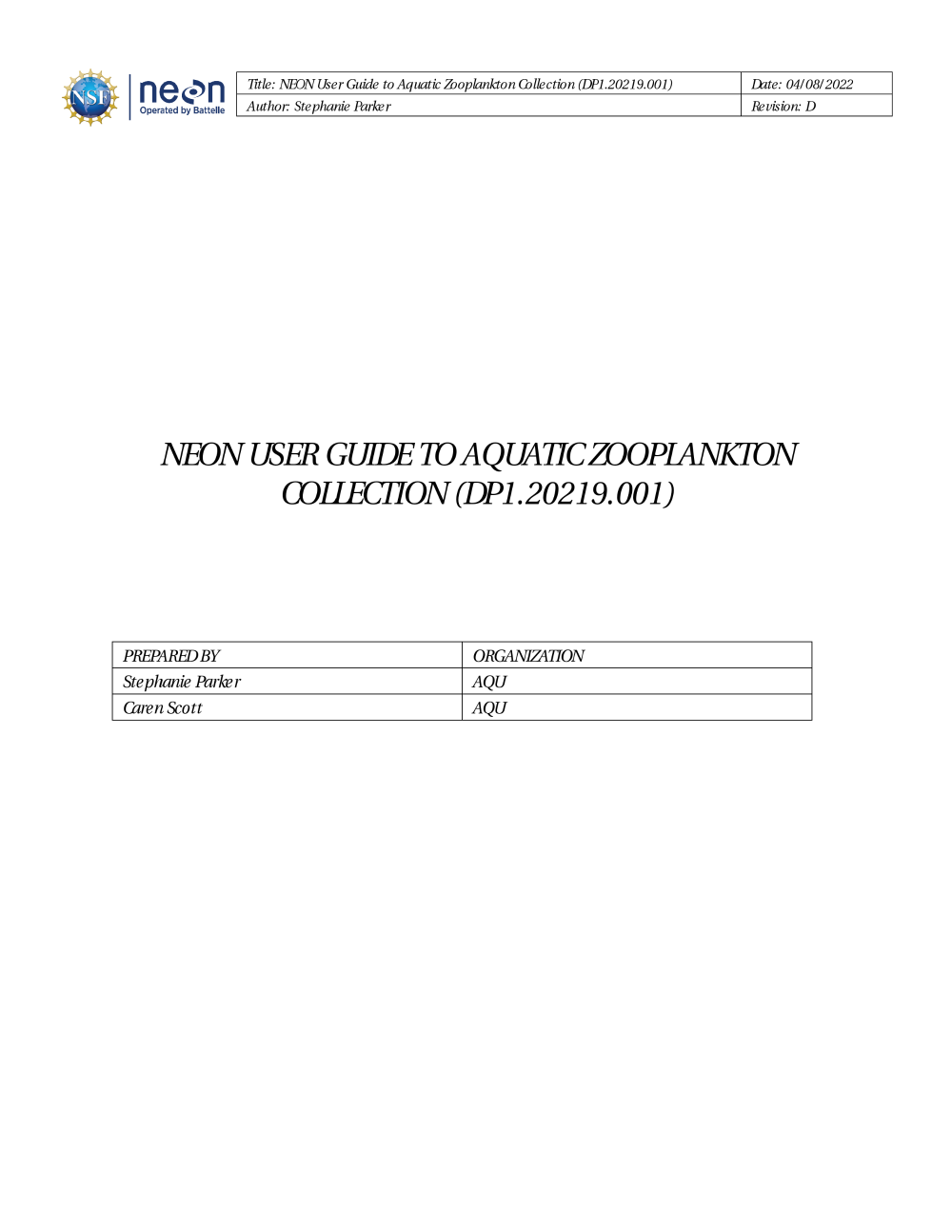 Uploaded by Data Staff, 4/13/22 12:16 PM NEON User Guide to Aquatic Zooplankton Collection (NEON.DP1.20219)