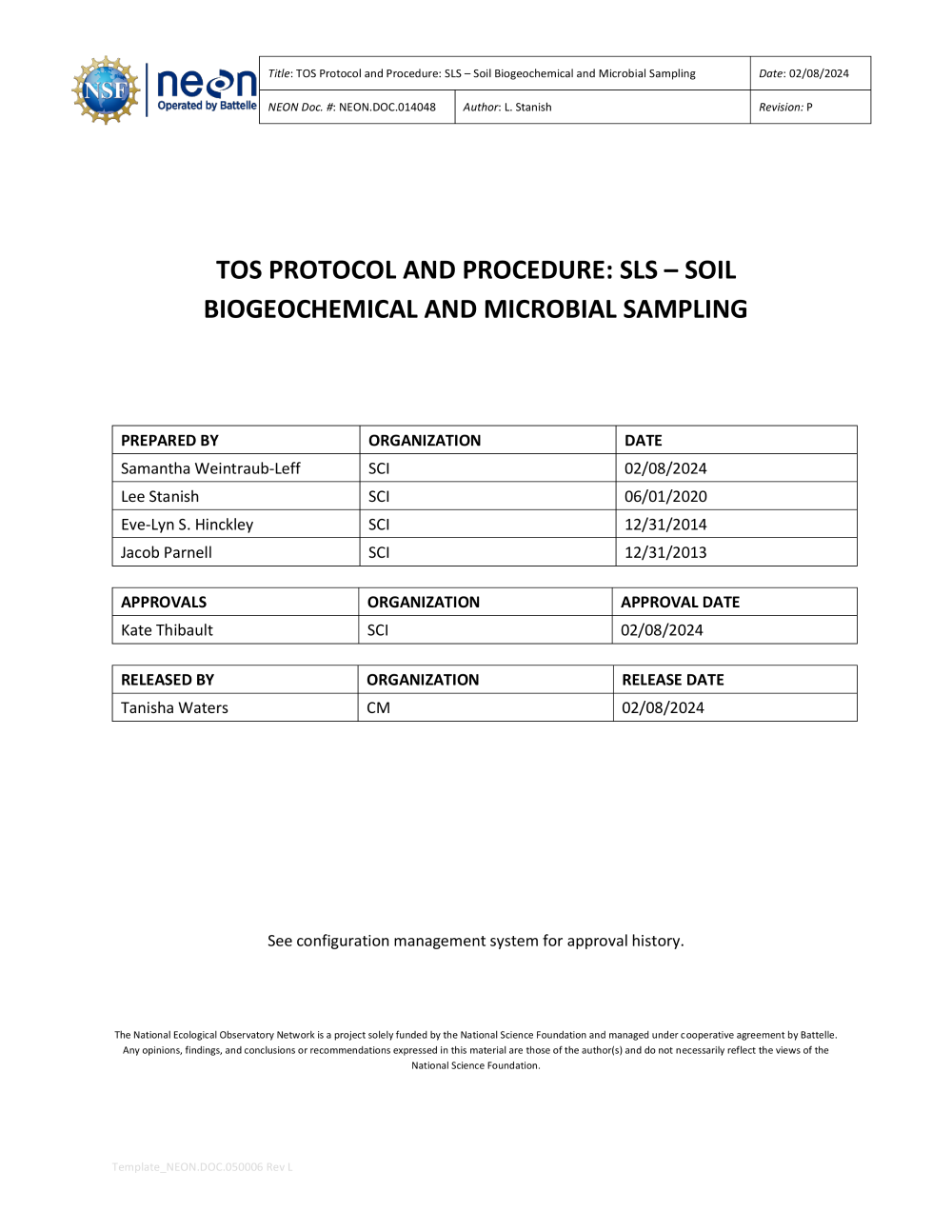 Uploaded by Data Staff, 2/14/24 4:26 PM TOS Protocol and Procedure: SLS – Soil Biogeochemical and Microbial Sampling