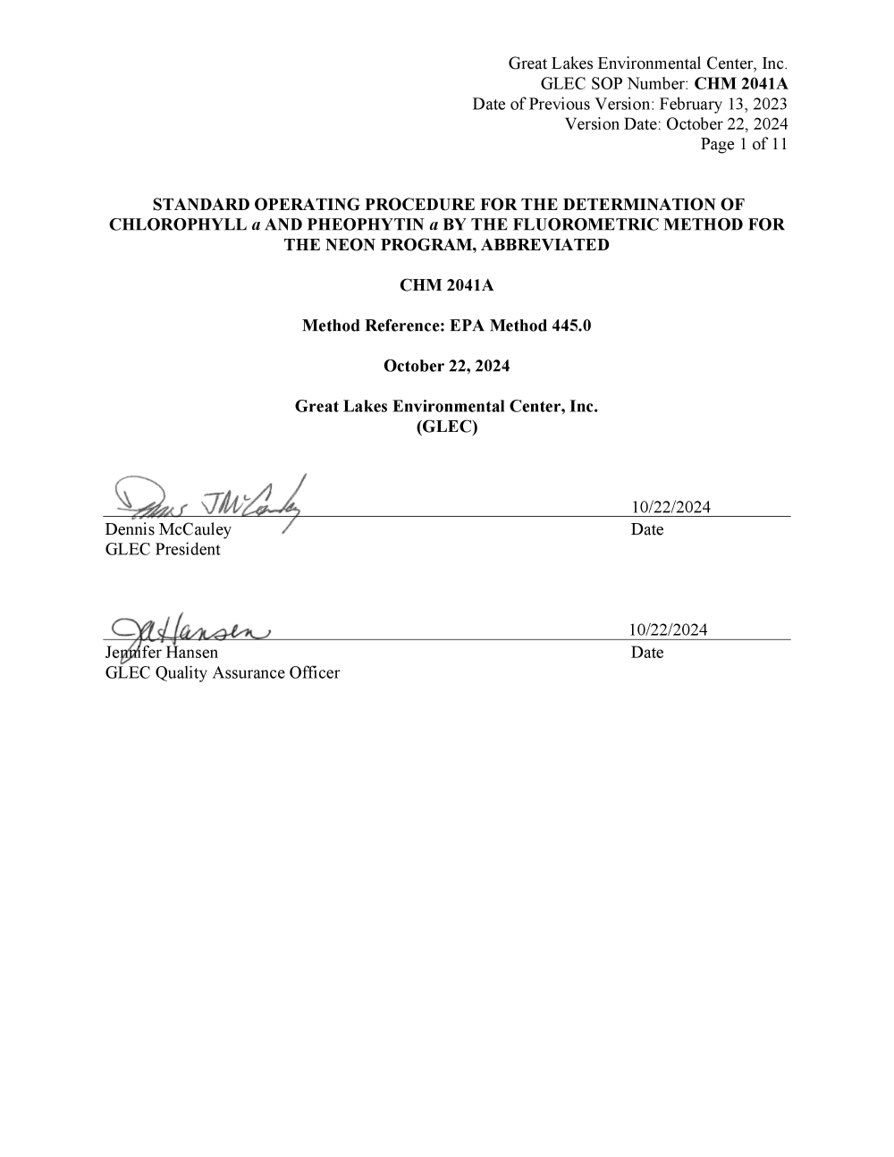 Standard Operating Procedure for the Determination of Chlorophyll a and Pheophytin a by the Fluorometric Method for the NEON Program, abbreviated