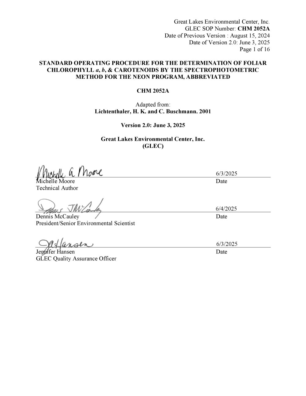 STANDARD OPERATING PROCEDURE for the Determination of Foliar Chlorophyll a, b, & Carotenoids by the Spectrophotometric Method for the NEON Program, Abbreviated