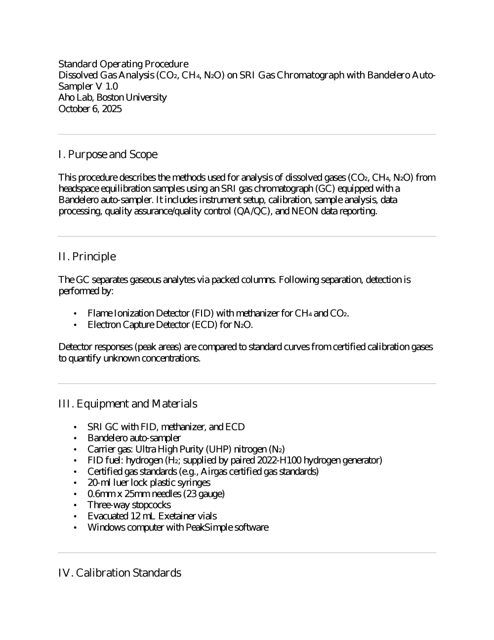 Standard Operating Procedure: Dissolved Gas Analysis (CO₂, CH₄, N₂O) on SRI Gas Chromatograph with Bandelero Auto- Sampler V 1.0 Aho Lab, Boston University