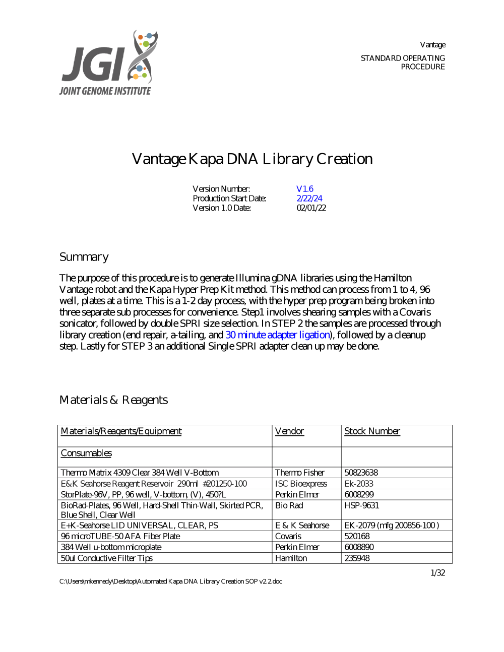 Joint Genome Institute SOP: Vantage Kapa DNA Library Creation